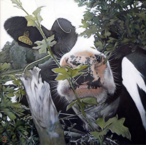 Cows viewed through a hedge, fence or gap in a wall have become a recurring theme in my work. Friesians grazing from Spring to Autumn next door in the fields have featured in my paintings for twenty years. Sadly, the herd was sold off this February as it was no longer profit-making. The herd had been reared by the same farming family for fifty years and had recently won a ‘best in show’ cup at the Royal Norfolk Show for a cow called Lucy.